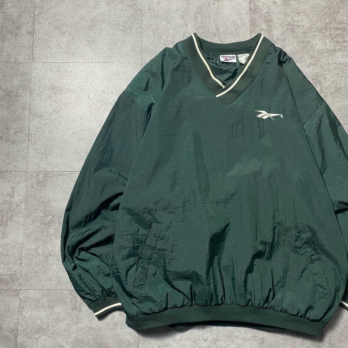90s Reebok 刺繍ワンポイント ベクターロゴ ラインリブ グリーン ナイロンプルオーバー