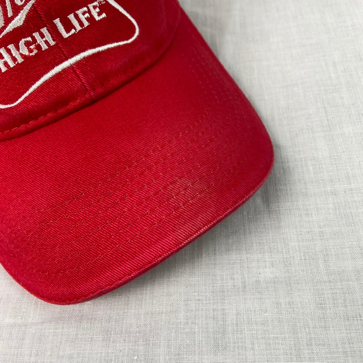 ■Miller HIGH LIFE ミラー ベースボールキャップ 企業ロゴ刺繍 メンズ レディース 古着 ビール 酒 ユニセックス 赤色【帽子】/レッド 【サイズ】表記 不明(フリーサイズ) ※計測値をご確認ください。 高さ…10.5 つば…7 頭周り(内径)…56~60.5 【生産国】中国製 【素材】コットン100% 【状態】ツバに若干の色褪せによる変色がございます。 画像にてご確認ください。 【c251216112】 ※古着は洗濯、検品などのケアを行っております。(新品・デッドストックは洗濯していません。)