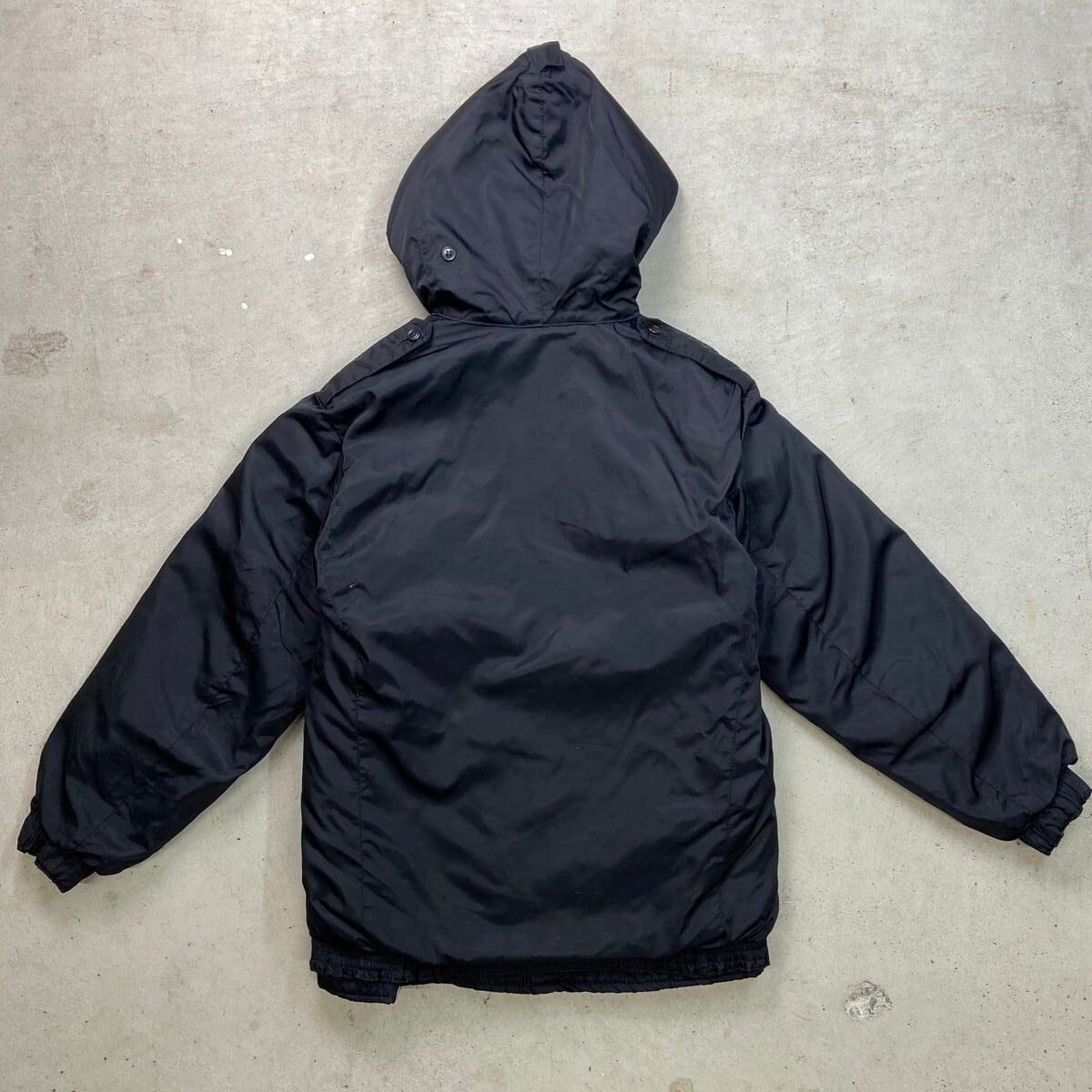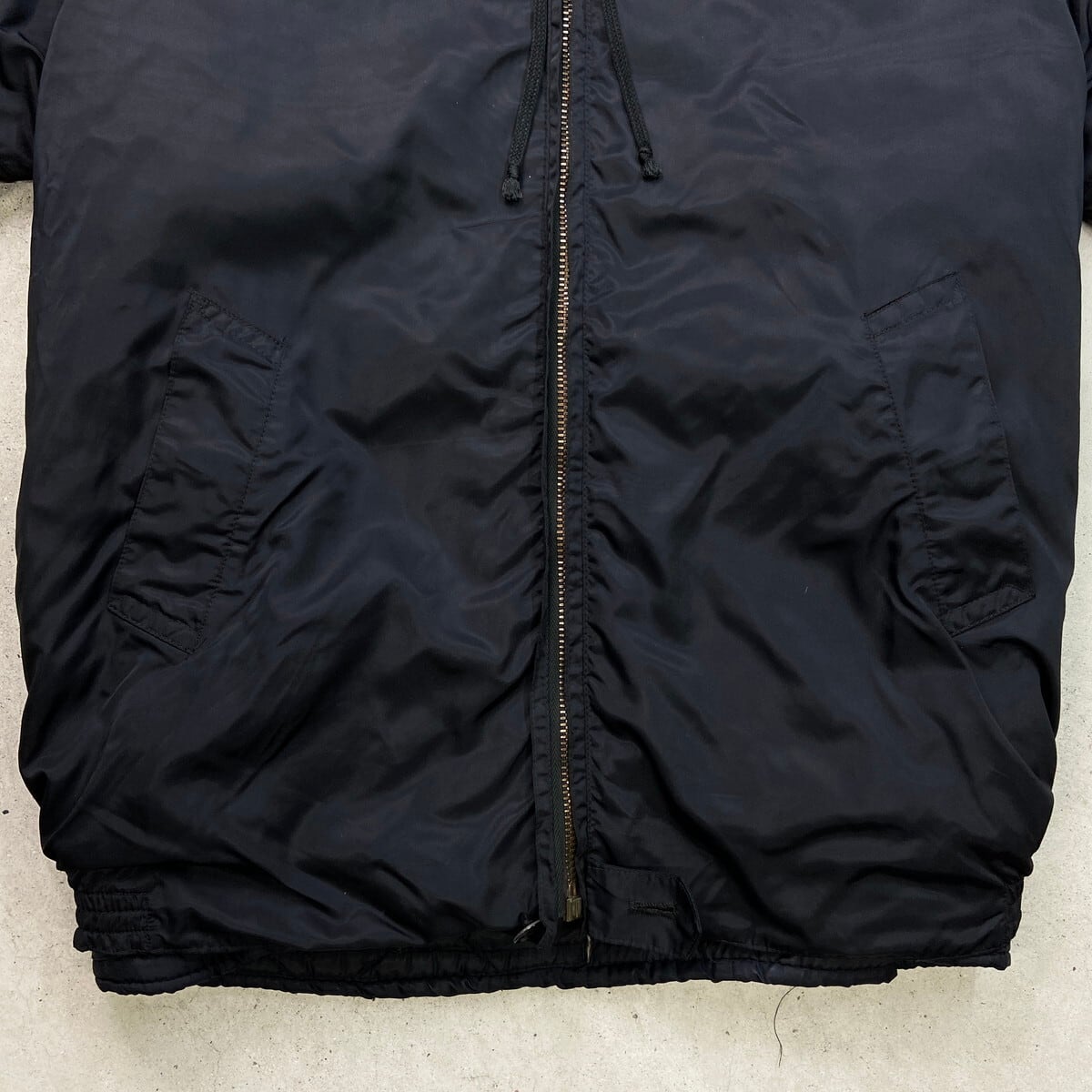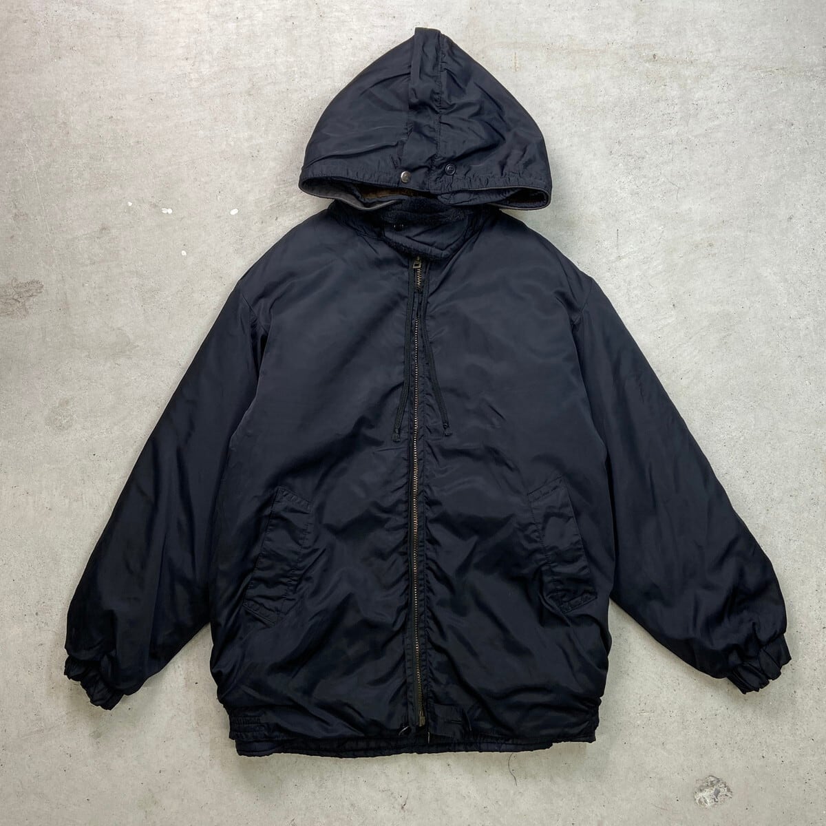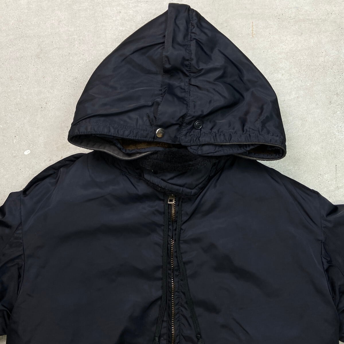 ■古着 UNKNOWN ミリタリーフライトジャケット N-2Bタイプ メンズL相当 ヴィンテージ VINTAGE USED キルティングライナー フード開閉式 アメカジ 黒色【ミリタリージャケット】/ブラック ◎フード開閉式などから造りは、着丈の長いN-2Bのサンプリングかと思われます。 【サイズ】表記不明(着用感メンズL相当) モデル身長172cm 計測値をご確認ください。 着丈…73 身幅…60 肩幅…52 袖丈…60 【生産国】不明 【素材】不明(おそらくナイロンかと思われます) 【状態】バックサイド左脇付近に汚れや小穴が数か所ございます。(写真8) 画像にてご確認ください。 【c251215108】 ※古着は洗濯、検品などのケアを行っております。(新品・デッドストックは洗濯していません。) ※モニターの発色により実物と異なる場合がございます。予めご了承ください。 ※ 海外直輸入USED品になります。