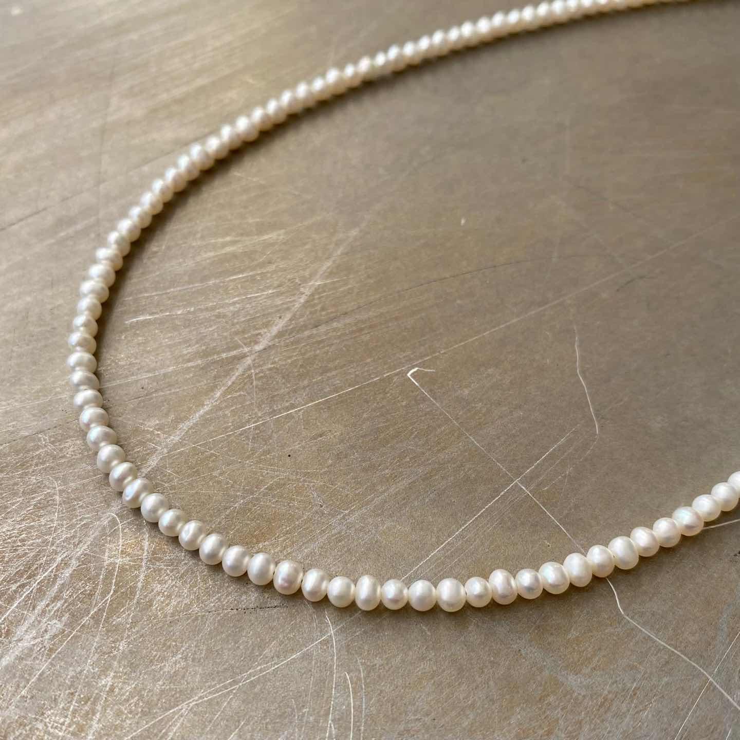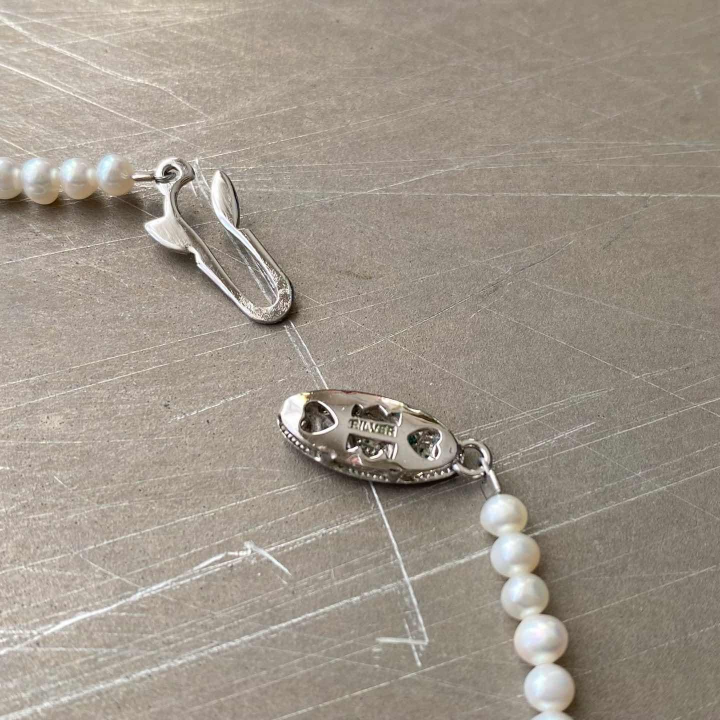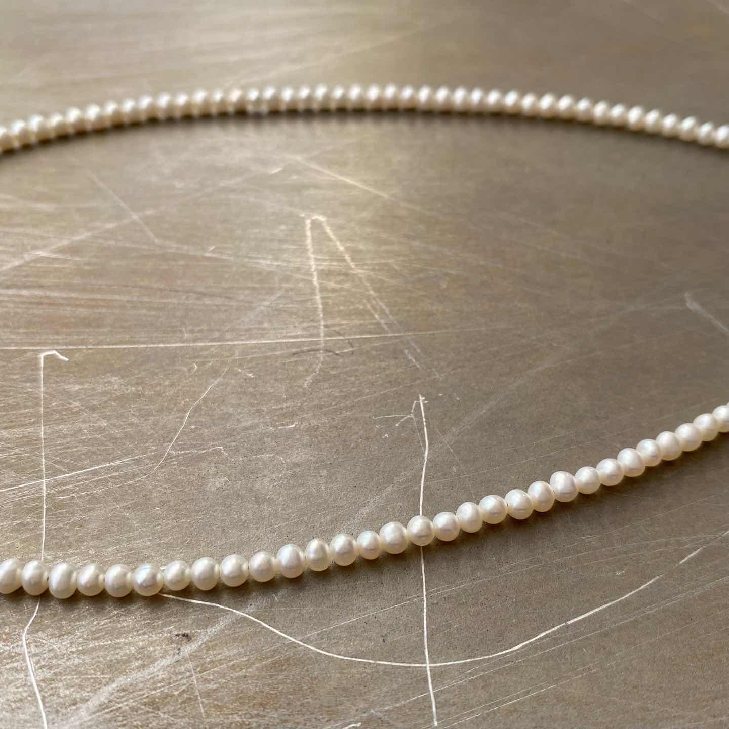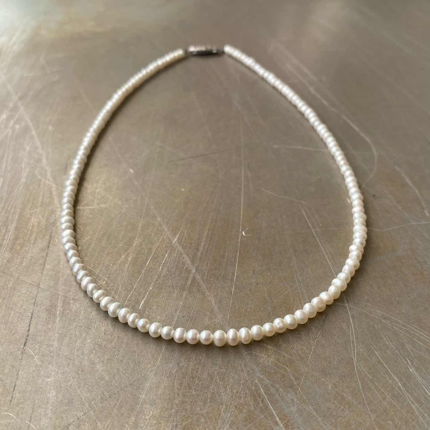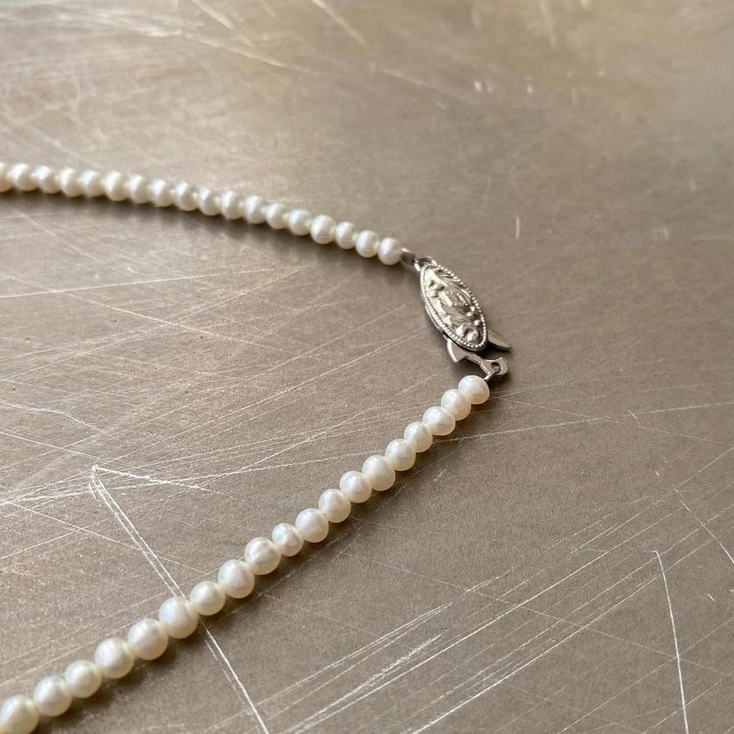繊細な淡水パールが魅力的なUSAヴィンテージネックレス。レトロな金具も素敵なポイント。身につけやすいサイズ感でお顔まわりに上品な雰囲気をプラスしてくれます。 □Materials 天然石(淡水パール)、SILVER(刻印入り) (※ワイヤー交換済) □Size 全長 約42.5㎝ パール幅 約4㎜ 8g □Condition【A】 使用感の少ない良好な状態です。中古品であることをご理解のうえお買い求めください。ご購入前に必ずショッピングガイドのご確認をお願いいたします。 【S】未使用 【A】未使用に近い 【B】やや使用感あり 【C】使用感あり Item No.3562