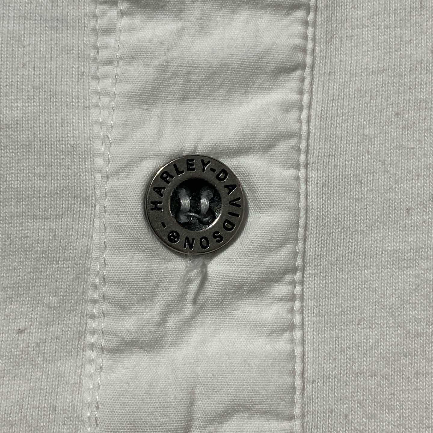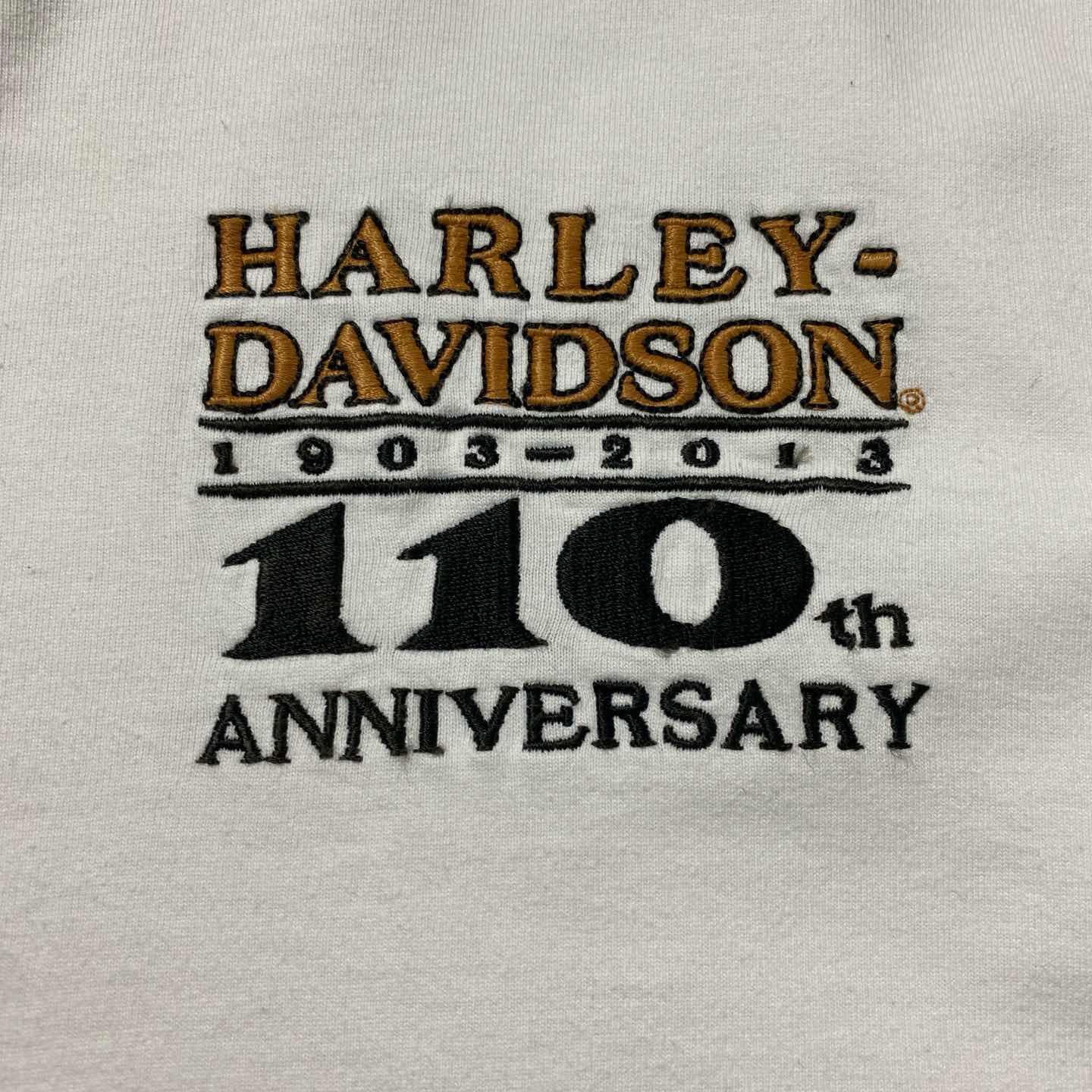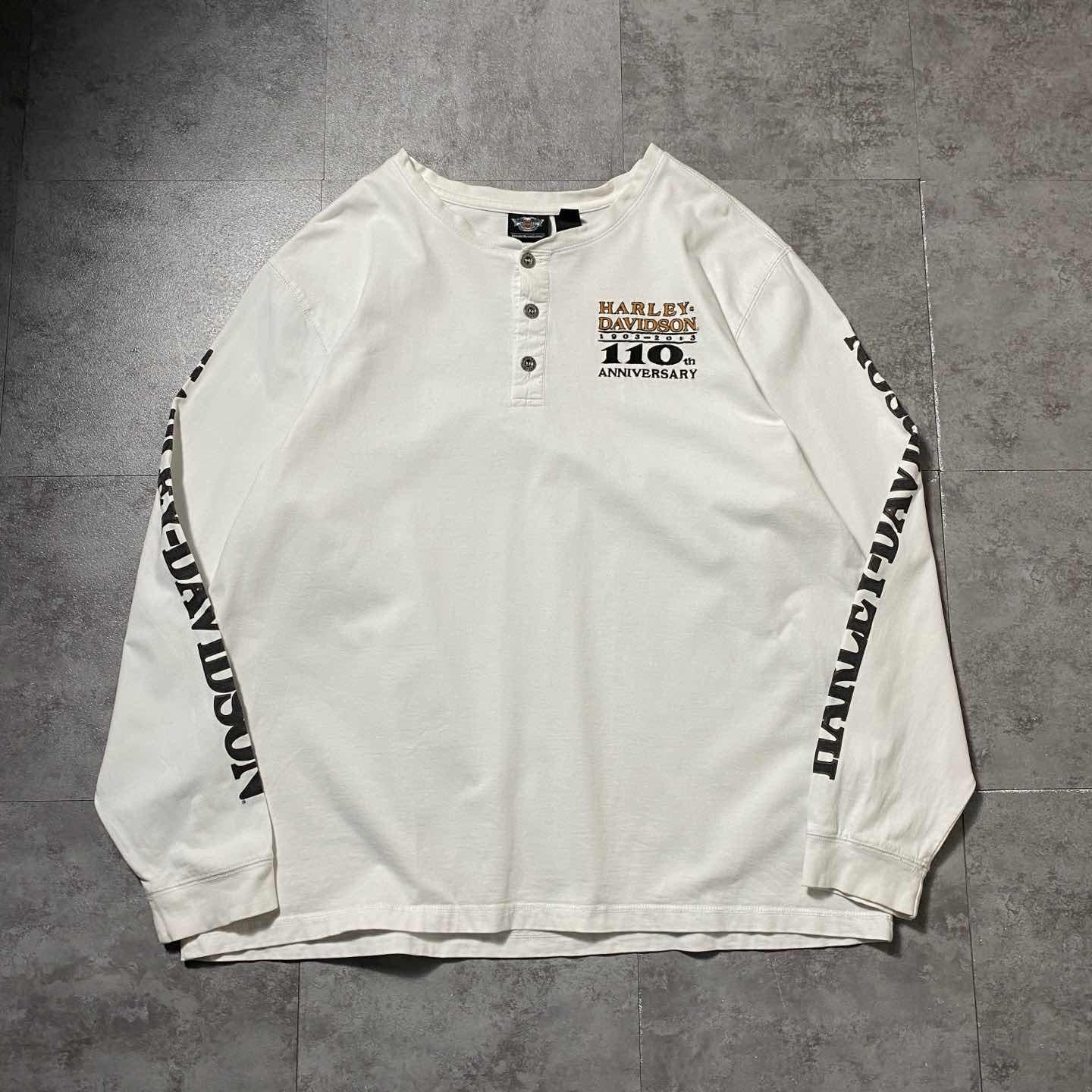 ハーレーダビッドソン 110周年刺繍ロゴ アームプリント ヘンリーネック ロンT