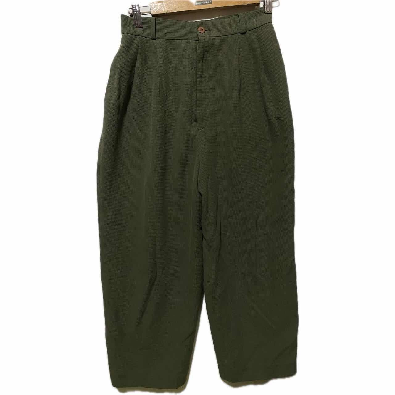 70s-80s vintage 凹凸waffle タック ワイデパボトム W66-83対応 クールに決まる premiervintageといっても過言では、ない、 変換期といわれるボトム、 70s初期は、少しフレアよりのタック、そこから、80sに、向けワイデパタックが流行りだす、それの 初期よって、70-80sが、かくてい、また、 【毛】ウール表記は、70sなんですが、※ウールは、冬じゃないの? って方は、激しく違います。 ↑化繊入れしてるから、年中いけますし、これで凹凸作ってるだけです、 凸凹入れる理由知ってますか?動きやすさです。だからミリタリーにつく使われるんですよ。 【さらに年代見極めPoint】 深めの2タック(プリーツ)入りハイウエスト気味 ワイドでテーパード気味のシルエット やや凹凸のある織り(サッカー調・ワッフル調のような表情)トラウザーの特徴にかなり近いです。 90中期年代以降はここまで深いタックはあまり よって、70-80s確定!! 【カラー】 凹凸だから、光都合で色変わります、オリーブカーキ、明るい場所だと、写真より明るくなる、?って方は、ミリタリーパンツイメージ下さい、 【サイズ表記無し】Mくらい? W66-83まで調節可 股上37ハイ決まる 股下64 腿渡37 裾幅24ワイデパおしゃれシルエット 【material】 キュプラ77 ポリ12 ウールピュアウール、11説明あるよう、凹凸に使用だから季節、ケア関係ない 【condition】 明らかに、美品premier