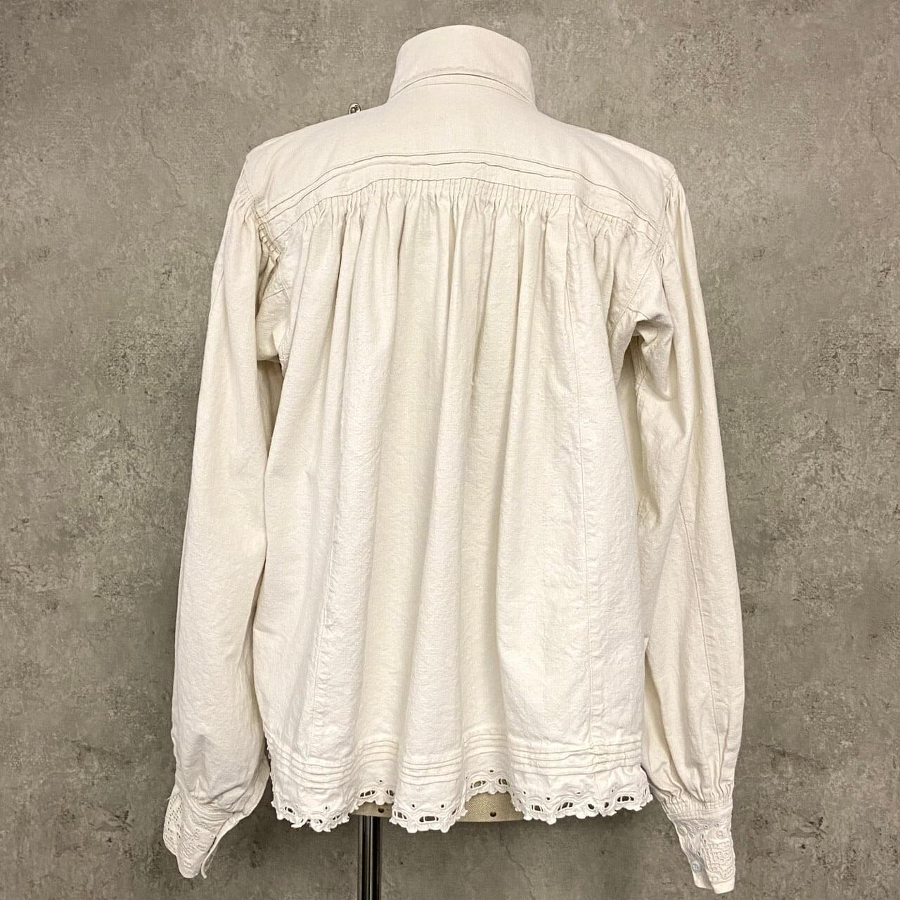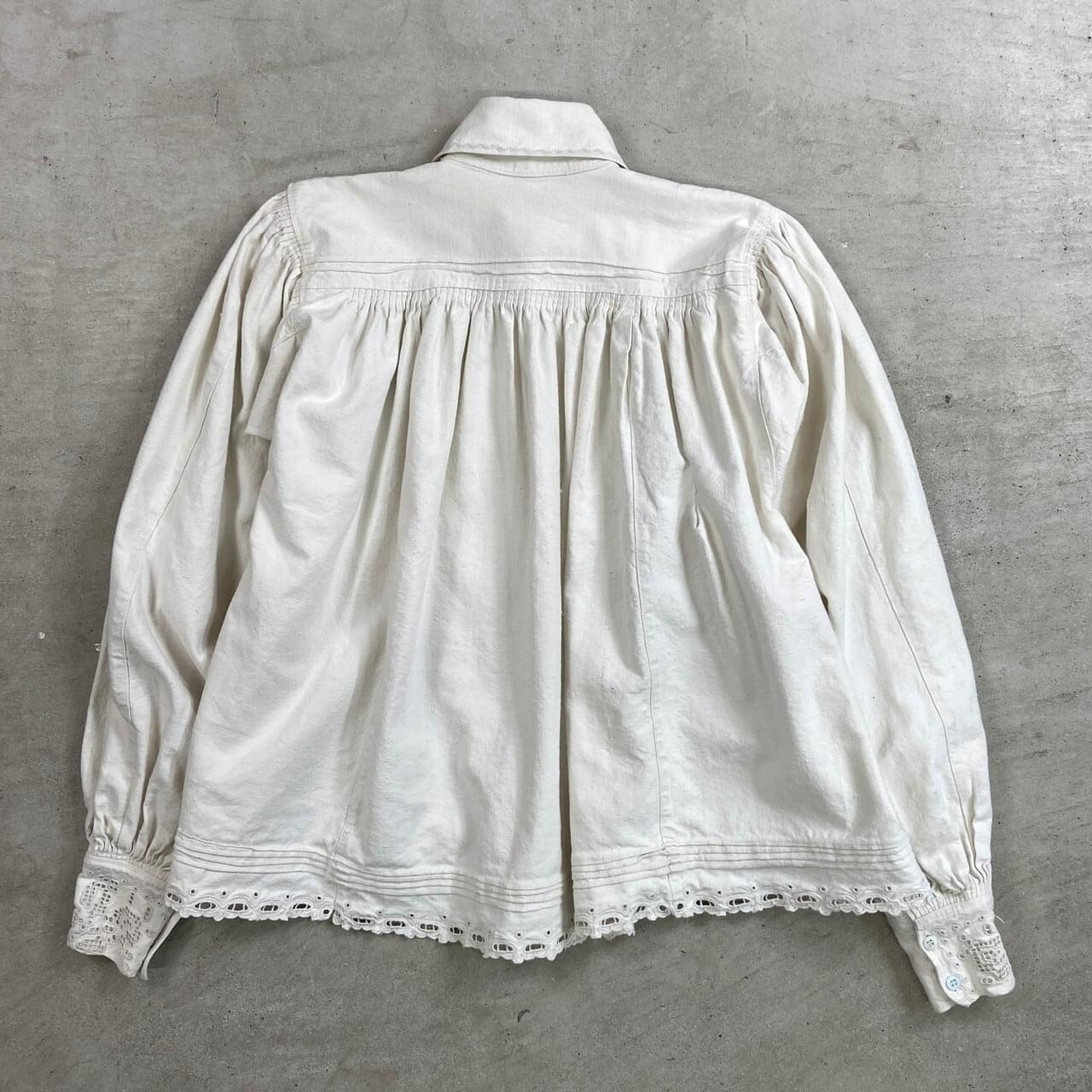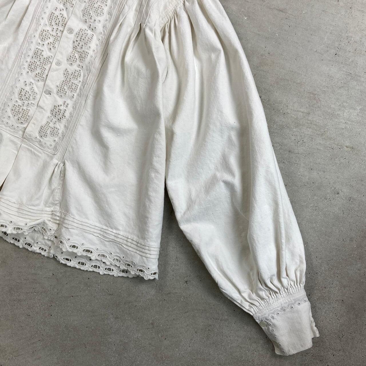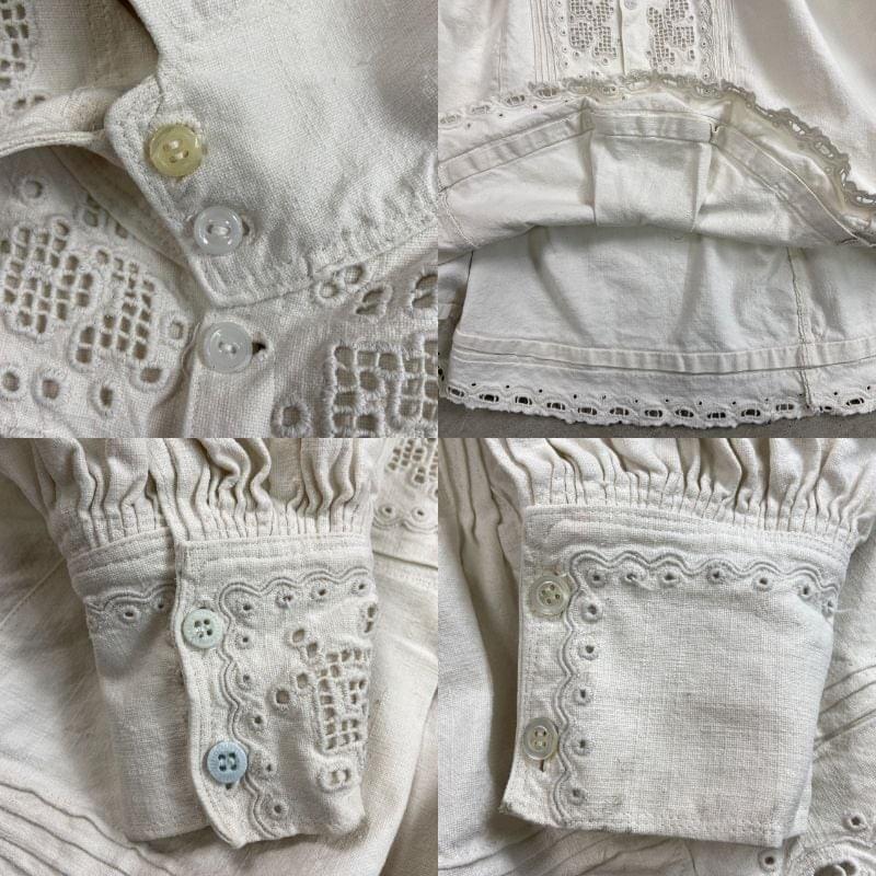 ■1900年代初頭 アンティーク ホワイトワーク刺繍ブラウス 白刺繍ブラウス レディースM相当 古着 VINTAGE ヴィンテージ フランスアンティーク エドワーディアン 白蝶貝ボタン コットンリネン 白色【ブラウス】/ホワイト 〇1900年代初頭から1920年代頃に作られた、極めて希少なアンティーク・ブラウスです。ルーマニア・ビホル(Bihor)地方の伝統的な手刺繍と、当時の西欧(エドワード朝~1920年代)の洗練されたテーラリングが融合した、歴史的価値の高い一着です。 コットンリネンのようなハリのある生地に、繊細なホワイトワークとピンタックが施された美しい一着です。ハリのある質感の中にも柔らかさがあり、アンティークならではの風合いになります。袖には細かなギャザーにより程よいボリュームスリーブ。白蝶貝ボタンも当時の時代を感じるディテールです。伝統的な民族衣装の多くが直線裁断のスモック型であるのに対し、こちらは「セットインスリーブ(肩のライン)」と「前開きのシャツ構造」を採用。身体のラインを美しく見せる西欧的なシルエットにアップデートされています。 脇はパネル切り替えによる立体的な仕立てになっています。 【サイズ】(着用感レディースM~L相当) ※計測値をご確認ください。 着丈…65 肩幅…40 袖丈…69 【生産国】フランスまたはフランス圏内(推定) 【素材】コットンリネンのような風合いの生地 【状態】100年以上前の商品ですが、目立ったダメージや汚れもほとんどなく着用感も感じられない状態です。画像でお確かめください。 【c260221150】 ※古着は洗濯、検品などのケアを行っております。(新品・デッドストックは洗濯していません。) ※モニターの発色により実物と異なる場合がございます。予めご了承ください。 ※ 海外直輸入USED品になります。