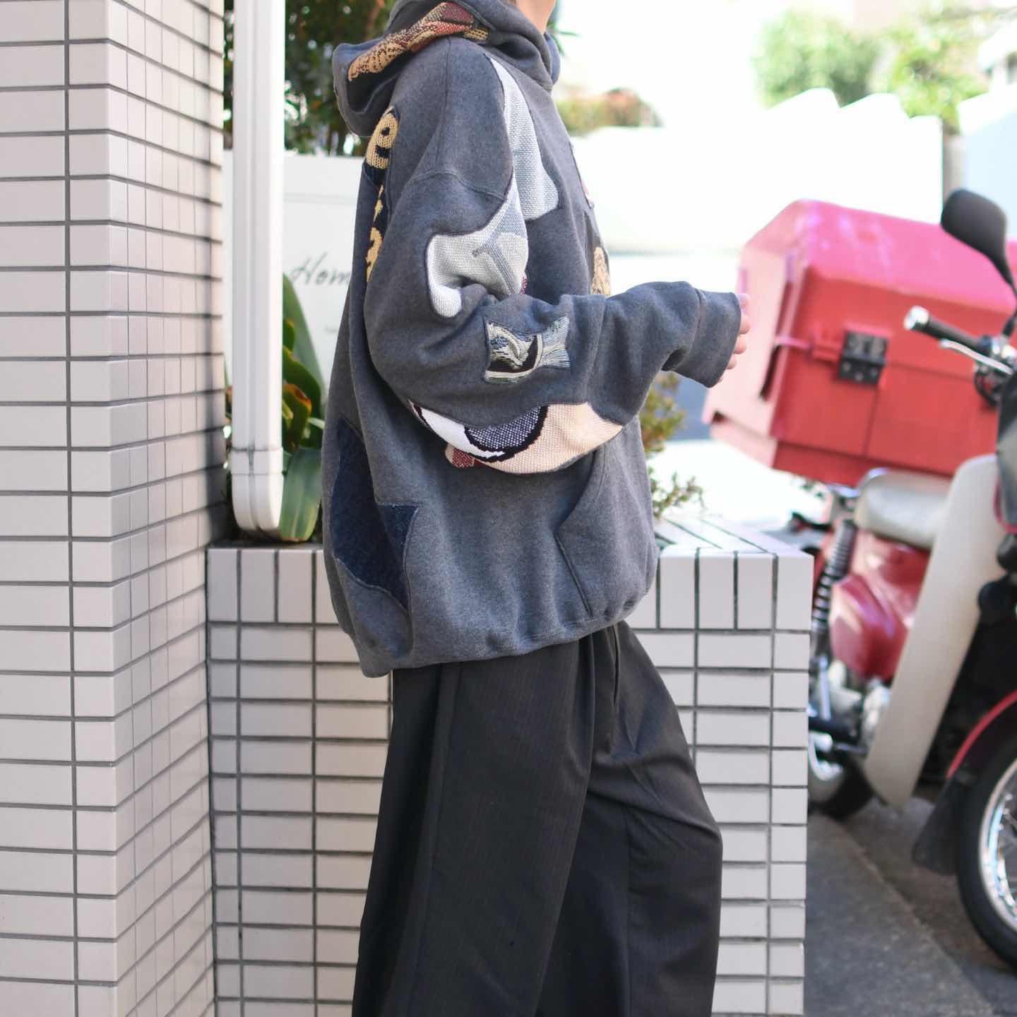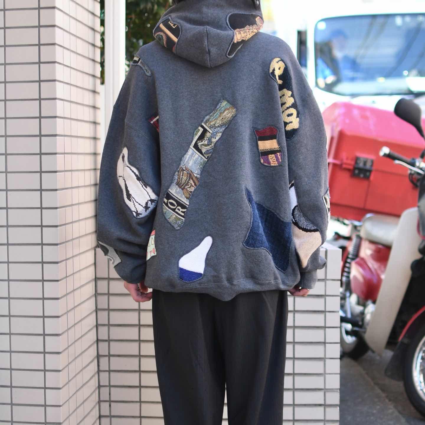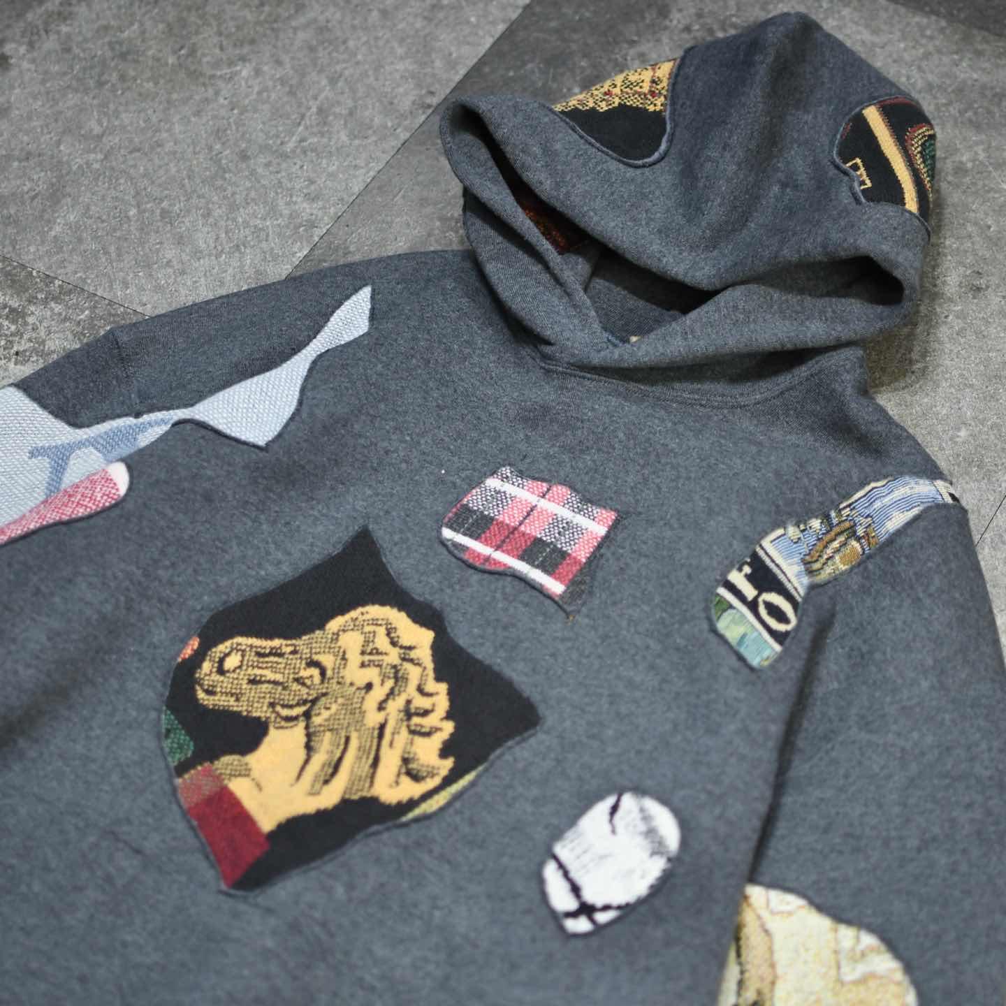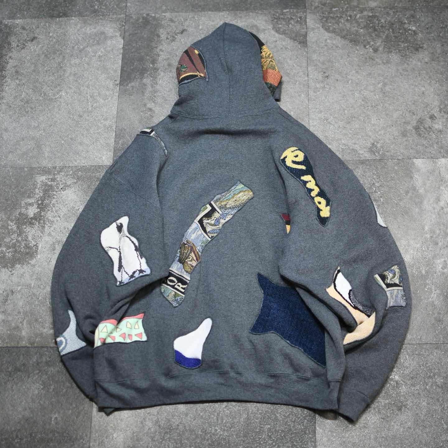 古着 リメイク つぎはぎ ラグ 絨毯 リメイク パーカー フーディ グレー