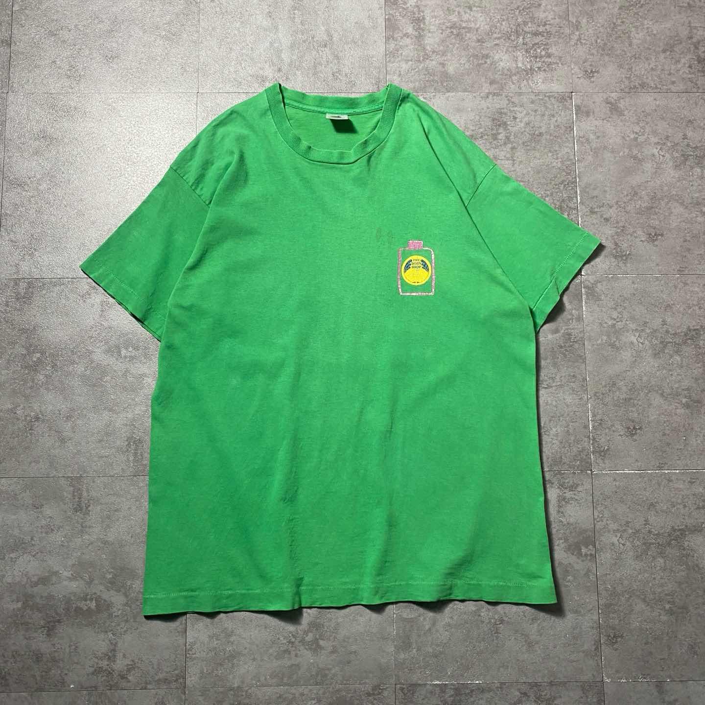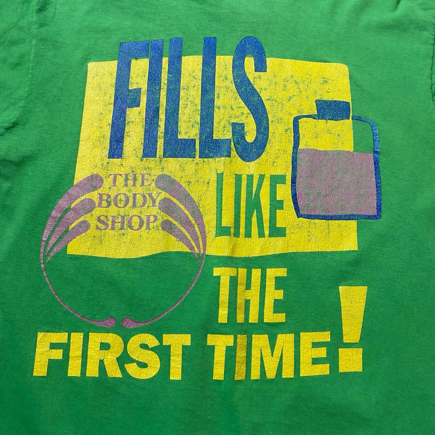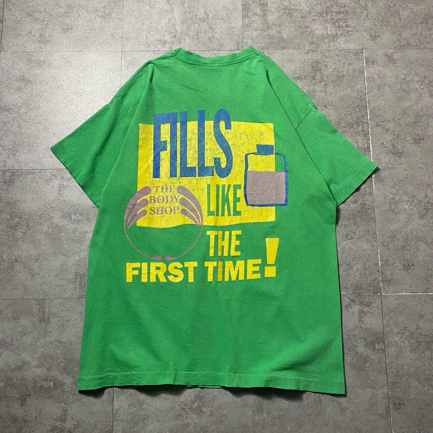 ◯ Explanation ◯ 90年代頃のTHE BODY SHOPプロモーションTシャツ。 ナチュラルコスメブランドとして世界的に知られる同ブランドの、販促用に制作された一枚です。 バックには「Fills like the first time!」のメッセージとボトルモチーフを大胆に配置。 イエロー×ブルー×ピンクの配色が90年代らしいポップな雰囲気を演出しています。 フロントにもワンポイントで同モチーフが入り、前後で統一感のあるデザインに仕上がっています。 ボディはFruit of the Loom製。 袖・裾ともにシングルステッチ仕様で、90年代特有のディテールもしっかりと確認できます。 プリントには経年によるクラックが見られますが、ヴィンテージらしい風合いとして雰囲気抜群のコンディションです。 企業系Tシャツの中でもデザイン性が高く、ファッションとしても取り入れやすい一着です。 ○Size○ 表記→XL ・着丈74 ・身幅60 ・肩幅52 ・袖丈19.5 (cm) ○Color○ ・グリーン ○Material○ ・100%コットン ○Condition○ ・フロント腹部に薄汚れ箇所あり ○Caution○ 当店で取り扱っている商材は全て『古着』となっております。 そのため、多少の状態難(ほつれ、傷、汚れ、リブの伸び、使用感、擦れ、色あせ、etc)がある場合がございます。 新品同様の完璧なお品物をお求めの方は当店でのお買い物を控えて頂きますよう宜しくお願いします。 また、購入された商品に関しましては、購入日時から起算して『72時間以内に』発送手続きの方を取らせて頂きます。 お急ぎの場合は購入前に当店オンラインストアの方にお問い合わせ頂きますよう宜しくお願いします。 26/549